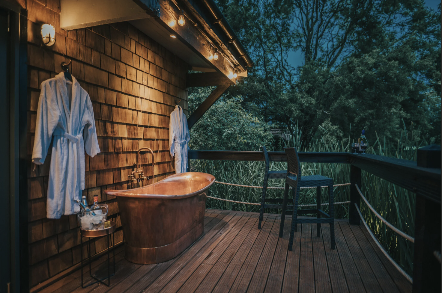 Nestled in the Cheshire countryside, this cosy cabin comes with its own outdoor copper bath on a private deck overlooking a tranquil lake. Ideal for an alfresco soak followed by stargazing. Add a wood-burning stove, king-size bed and countryside peace, and it’s a dreamy hideaway for two.